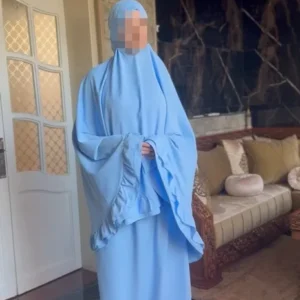 - تصميم فريد: يتكون من بلوزة أنيقة مع رباط خلفي (bandeau) يضمن الثبات أثناء الصلاة، وتنورة مريحة بخصر مطاطي (élastique) لتوفير أقصى درجات الراحة.